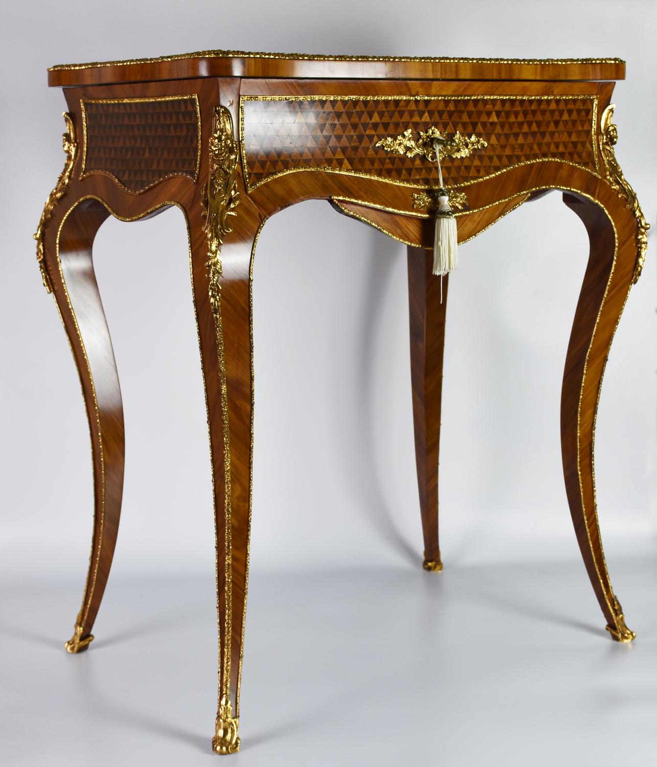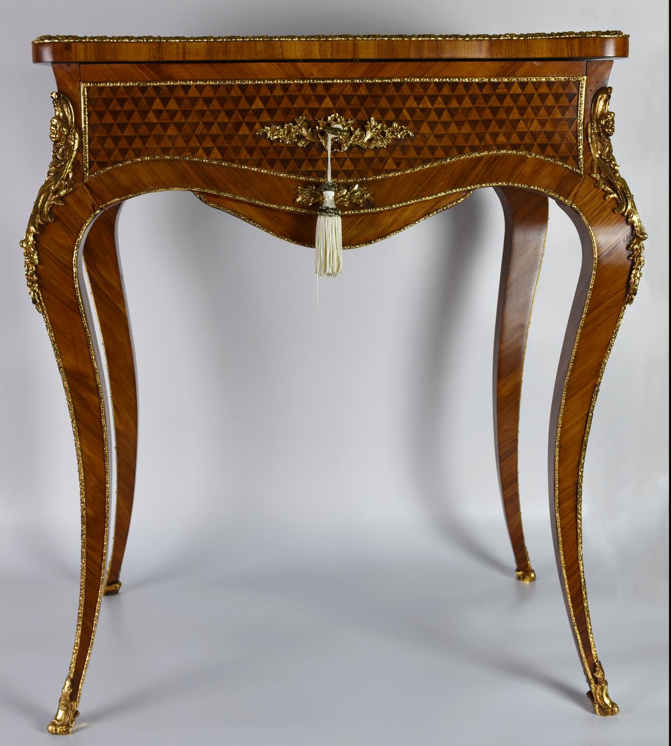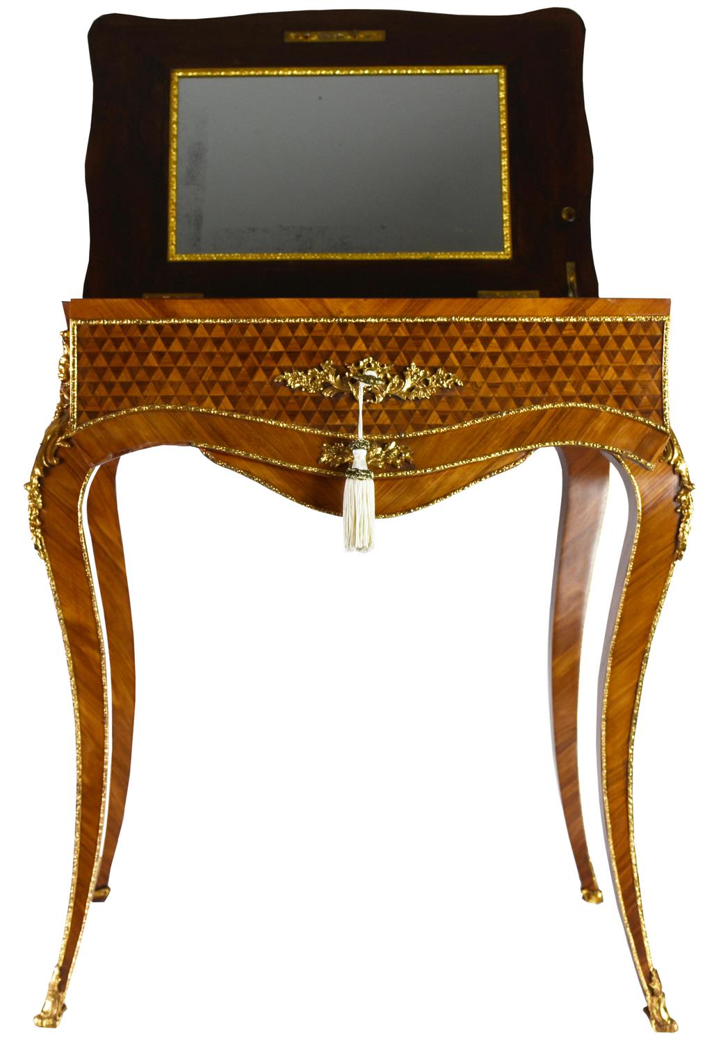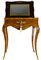 palissandro, struttura elegante con intarsi e bronzi dorati; cassettino frontale e specchio all'interno della ribalta