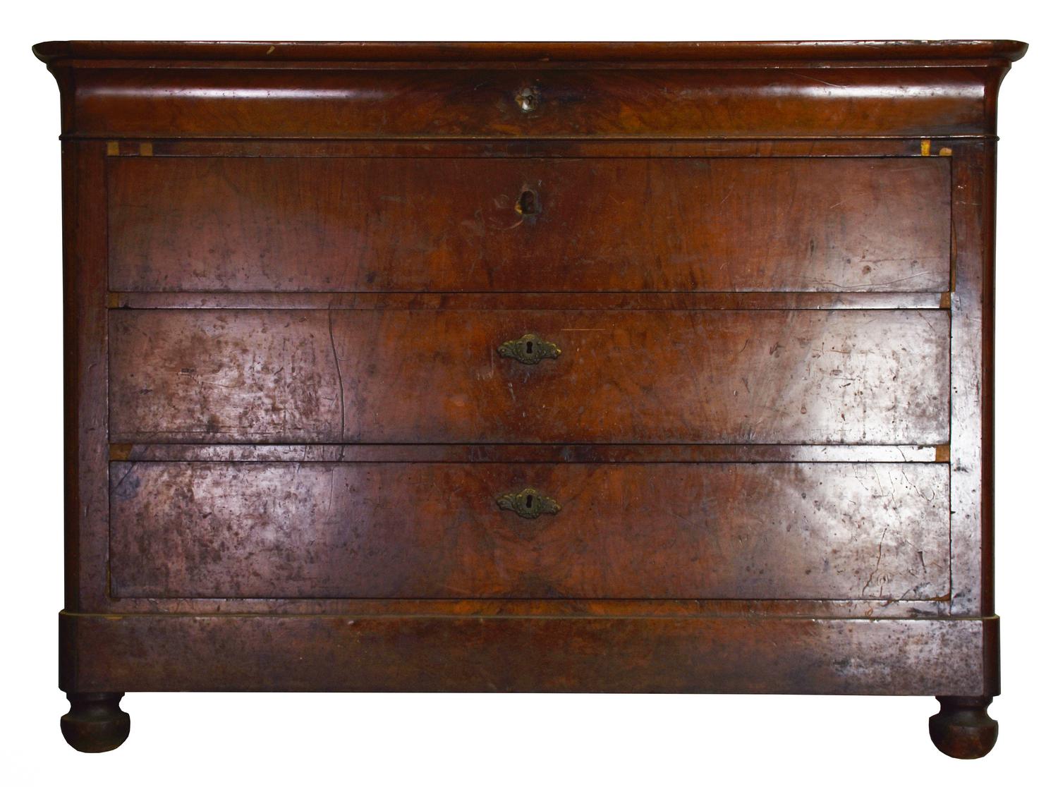 legno di noce e radica di noce, struttura a quattro cassetti, con un cassetto più piccolo collocato in corrispondenza della fascia e piedi torniti