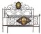 ferro battuto e ottone, testata e pediera traforate con decorazione a volute, centrate da pannelli dipinti