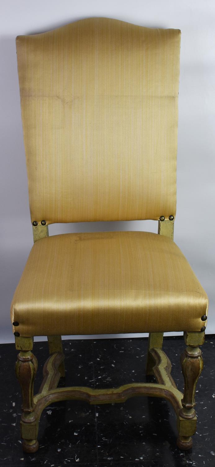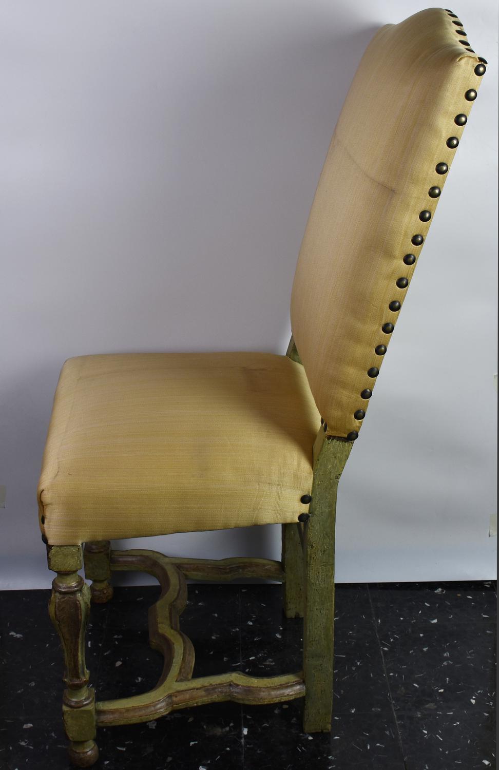 legno laccato, gambe frontali tornite e sfaccettate, schienale alto e seduta rivestiti