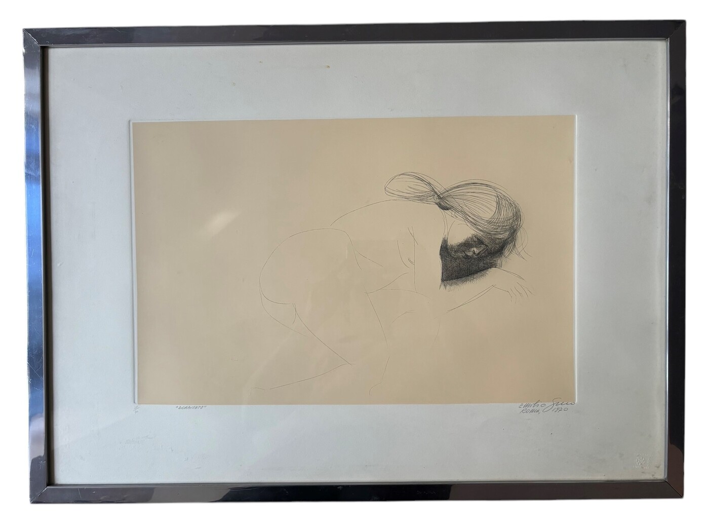 Firmato e datato a mano in basso a destra. Esemplare 29/100. Stampatore Alberto Caprini. Timbro a rilievo. In cornice.