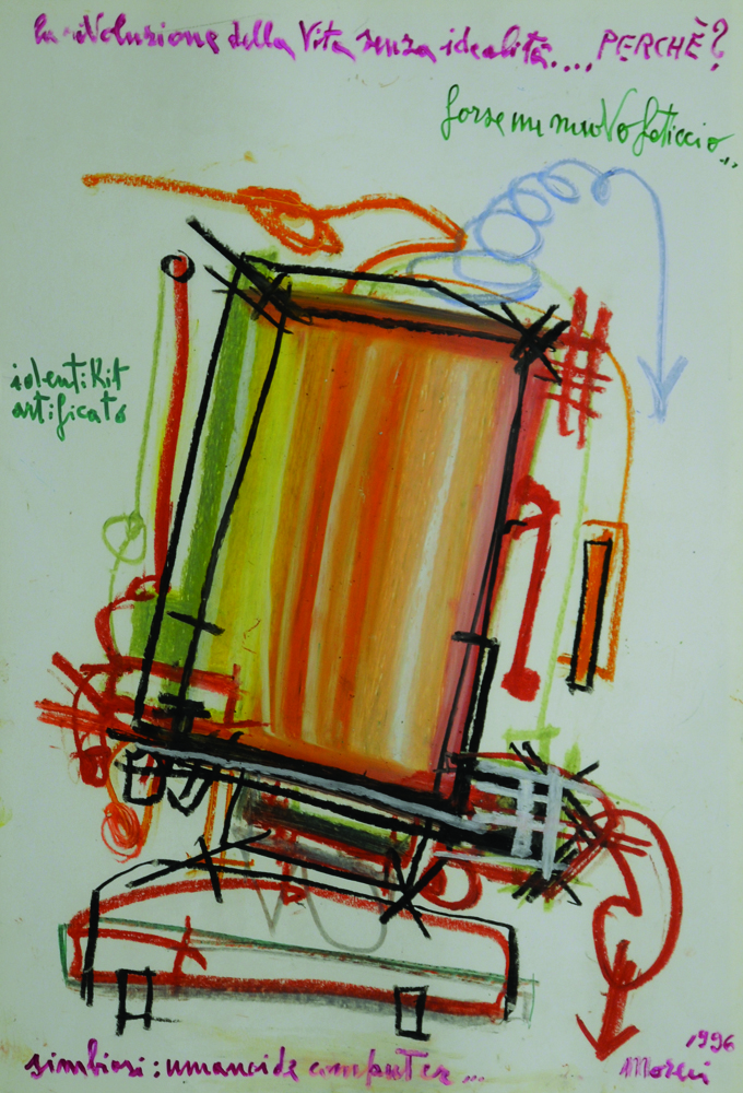 Firmato, datato. MATTIA MORENI (1920 – 1999) - " Simbiosi - umanoide computer ", 1996, Pastelli ad olio su carta, cm. 72 x 49. Firmato e datato in basso a destra. Autentica Archivio Moreni su fotografia. Autentica Yvonne Moreni su fotografia. Prov. Collezione Privata