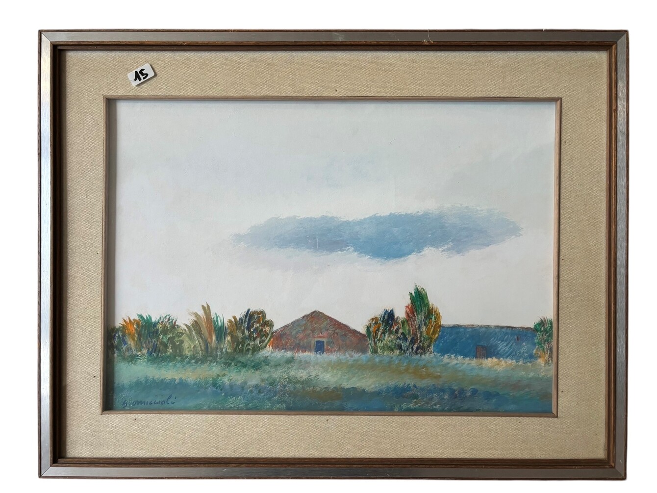 Giovanni Omiccioli (1901 - 1975) Casa e capanno a Passoscuro tecnica mista su cartone 36 x 51 cm