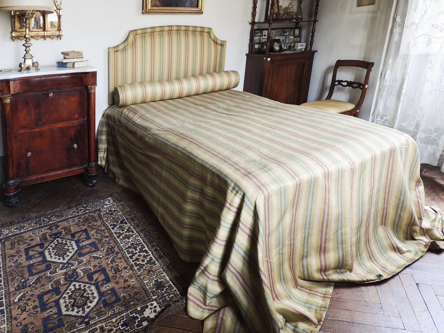 TESTIERA PER LETTO SINGOLO di forma sagomata, imbottita e rivestita in tessuto rigato nei toni del rosso verde e giallo corredata di cuscino a rullo e copriletto (3)