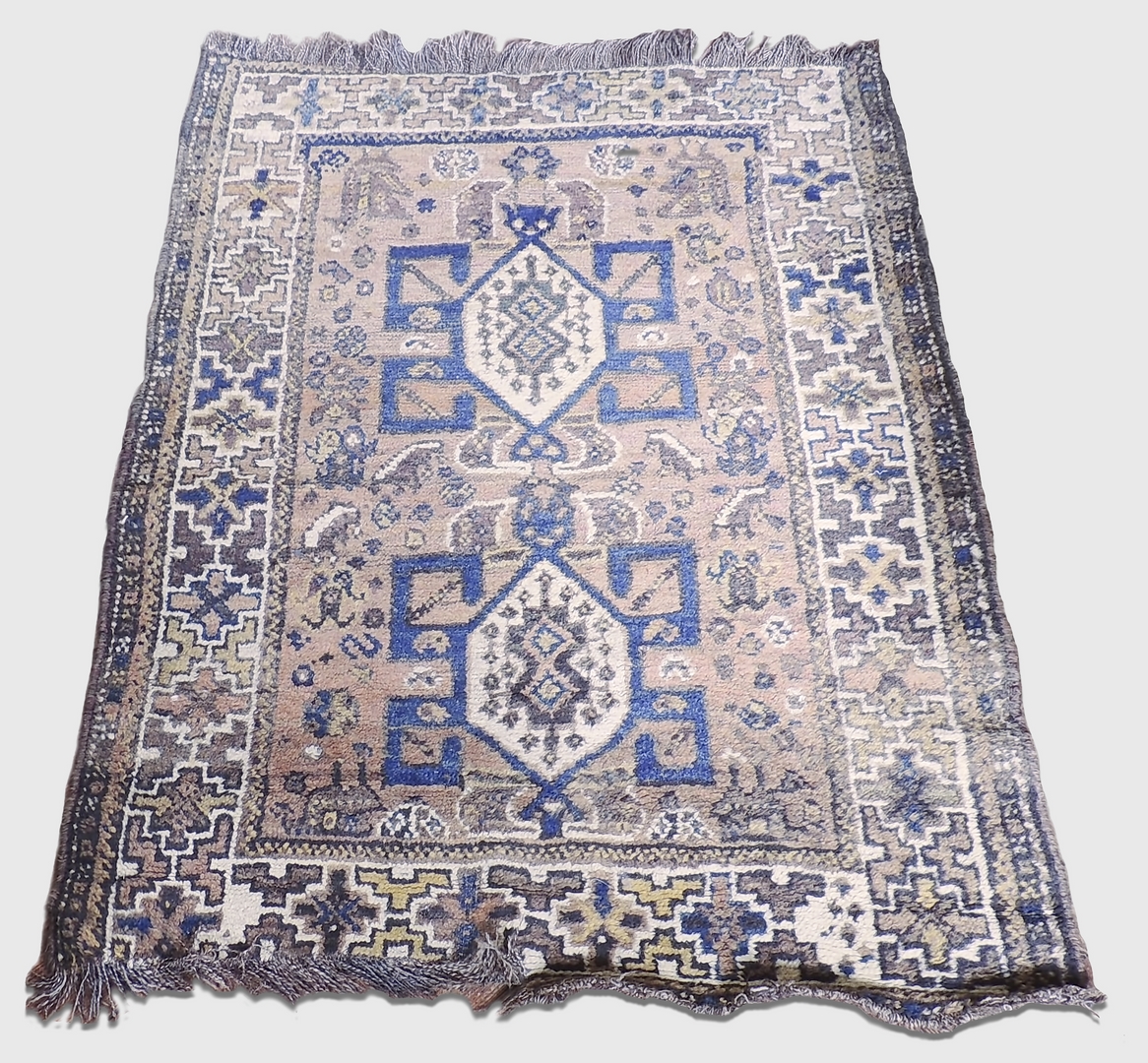 COPPIA DI PICCOLI TAPPETI CAUCASICI fondo beige, campo con disegni geometrici nei toni del blu e dell'avorio difetti cm 117x87