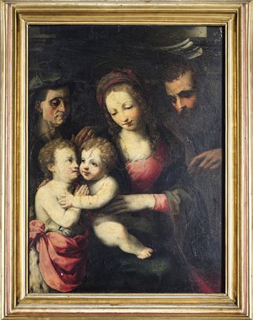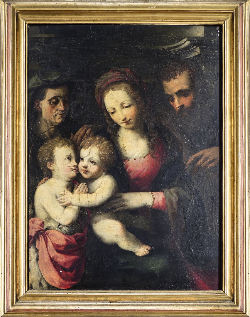 SACRA FAMIGLIA CON SANT'ELISABETTA E SAN GIOVANNINO Scuola toscana del XIX secolo olio su tavola da Francesco Vanni, in cornice coeva in oro zecchino cm 63,4x44,4
