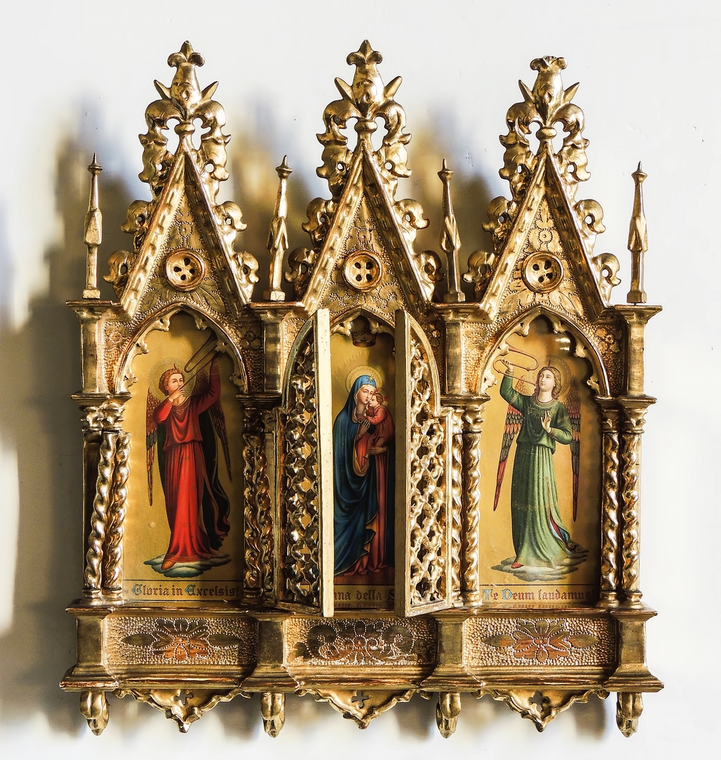 TRITTICO IN LEGNO INTAGLIATO E DORATO seconda metà del XIX secolo fronte tripartito da colonne tortili, cimase sormontate da gigli fiorentini, contenente soggetti religiosi da Beato Angelico, difetti cm 40x34
