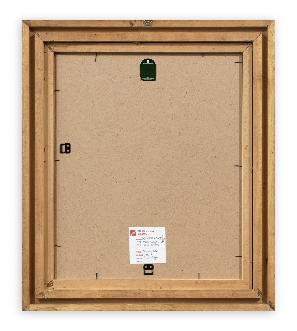 Etichetta della Galleria Shop-Art (MI) al retro della tavola protettiva