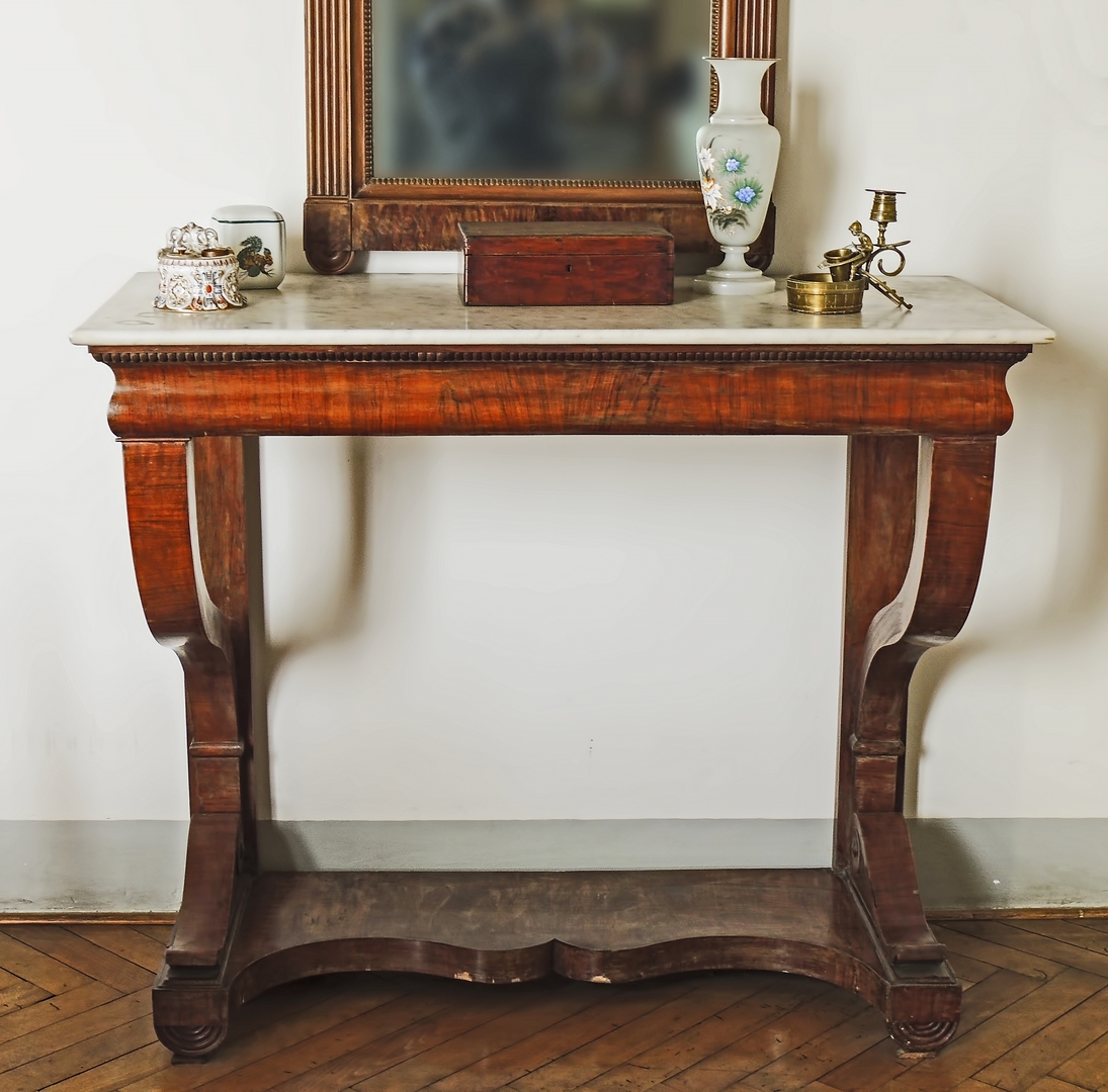 CONSOLE IMPIALLACCIATA IN NOCE prima metà del XIX secolo piano in marmo...
