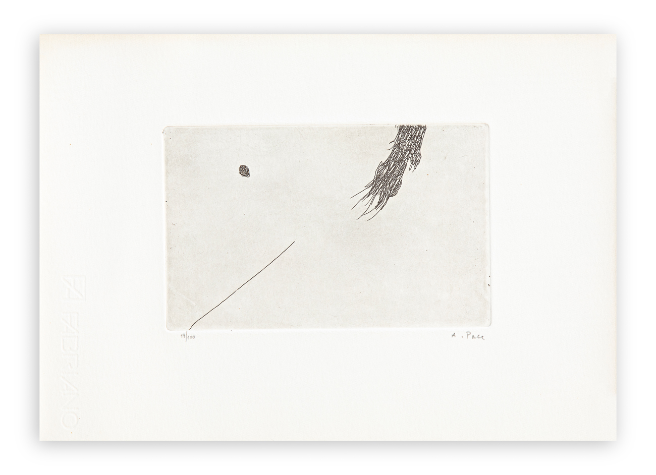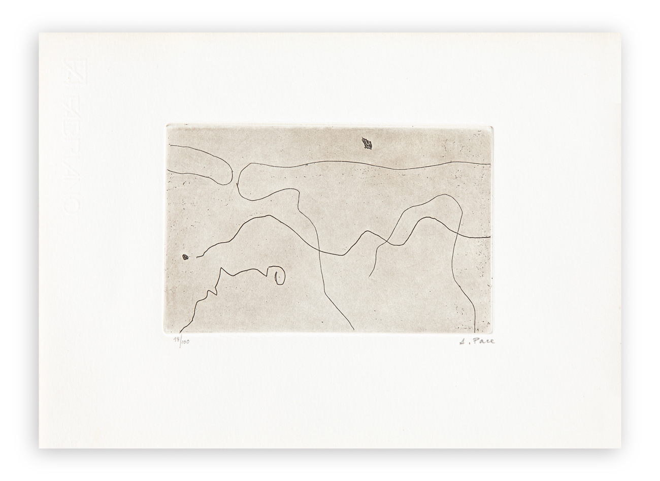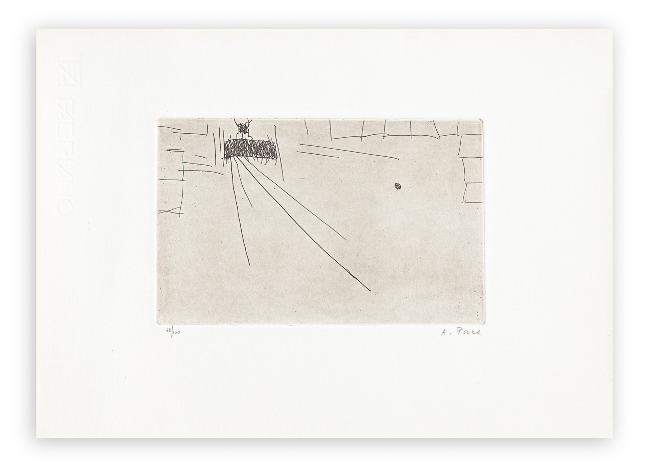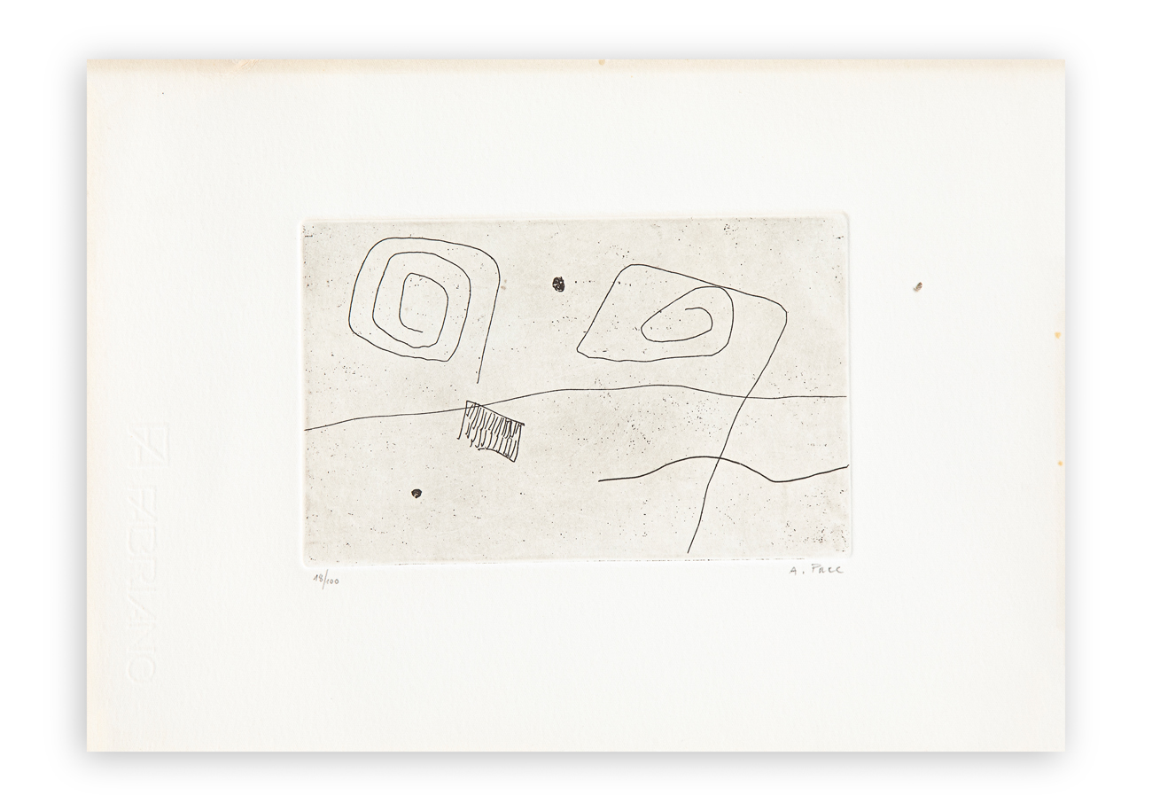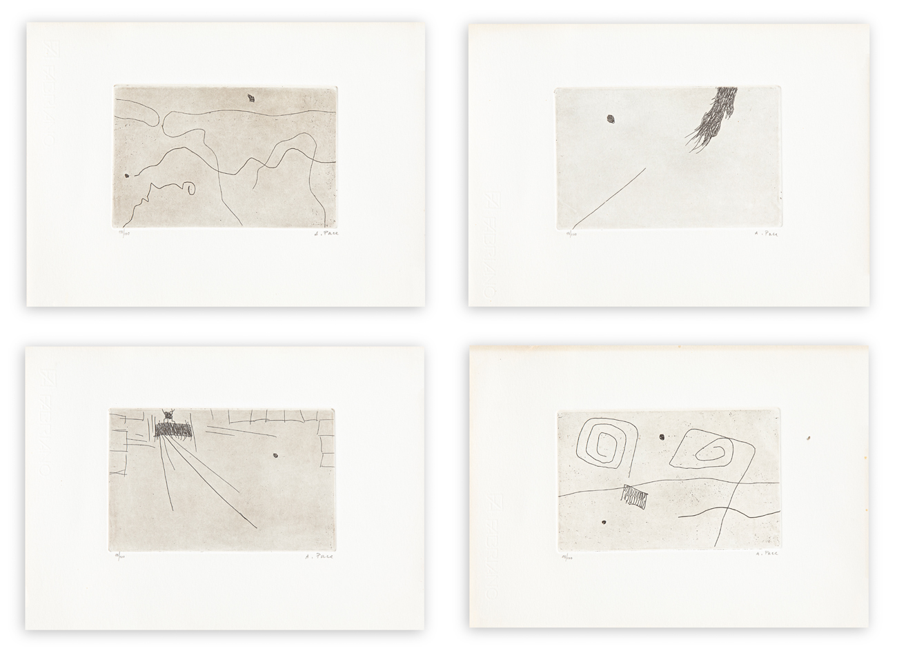 Cartella contenente 4 acqueforti di Achille Pace, ciascuna recante firma e numerazione (Esemplare 18/100) a matita al fronte