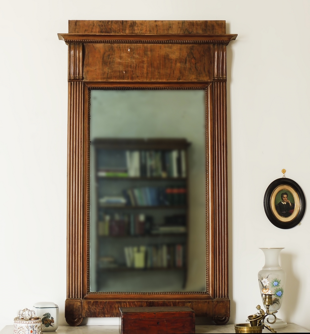 SPECCHIERA IN NOCE inizio del XIX secolo cappello modanato, lesene scanalate,...
