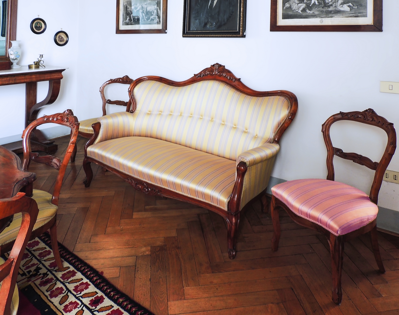 DIVANO IN NOCE seconda metà del XIX secolo schienale sagomato e intagliato, gambe mosse, imbottito e rivestito in tessuto a righe nei toni del giallo lungh cm 158