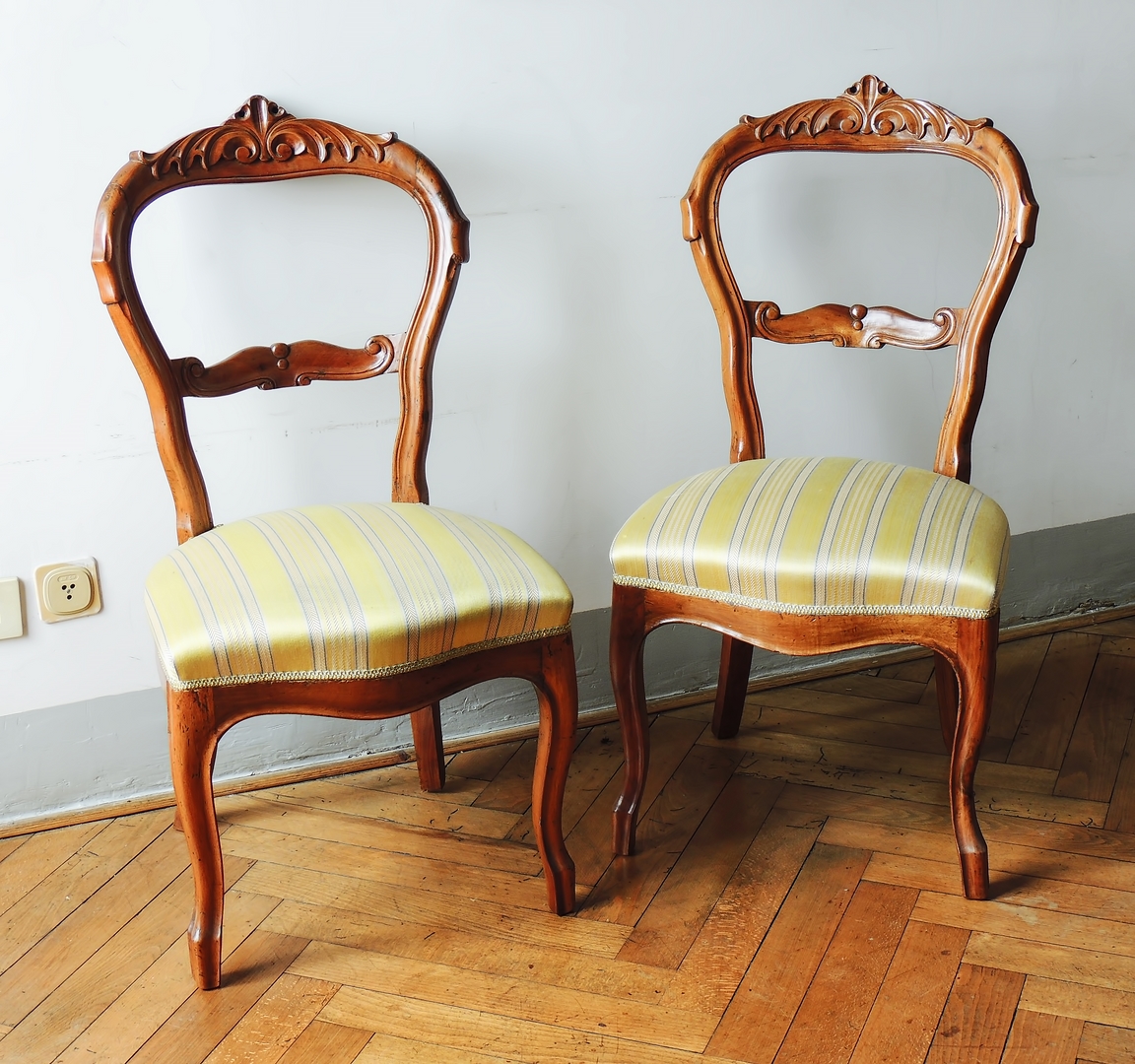 SERIE DI SEI SEDIE IN NOCE seconda metà del XIX secolo schienale intagliato con cartella sagomata, gambe anteriori mosse, le posteriori a sciabola, seduta imbottita e rivestita in tessuto a righe nei toni del giallo