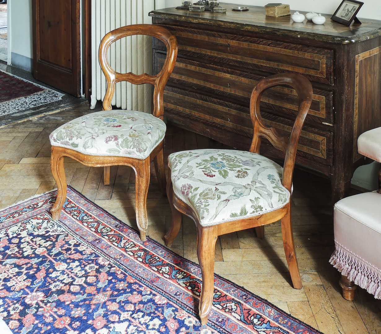 SERIE DI QUATTRO SEDIE BASSE IN NOCE seconda metà del XIX secolo schienale arrotondato con cartella sagomata, gambe anteriori mosse e posteriori a sciabola, seduta imbottita e rivestita in tessuto operato a fiori ed una da balia (5)