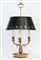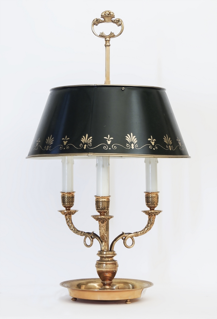 LUME DA TAVOLO IN OTTONE tre luci, presa centrale sagomata con animali fantastici, paralume in metallo dipinto h cm 59