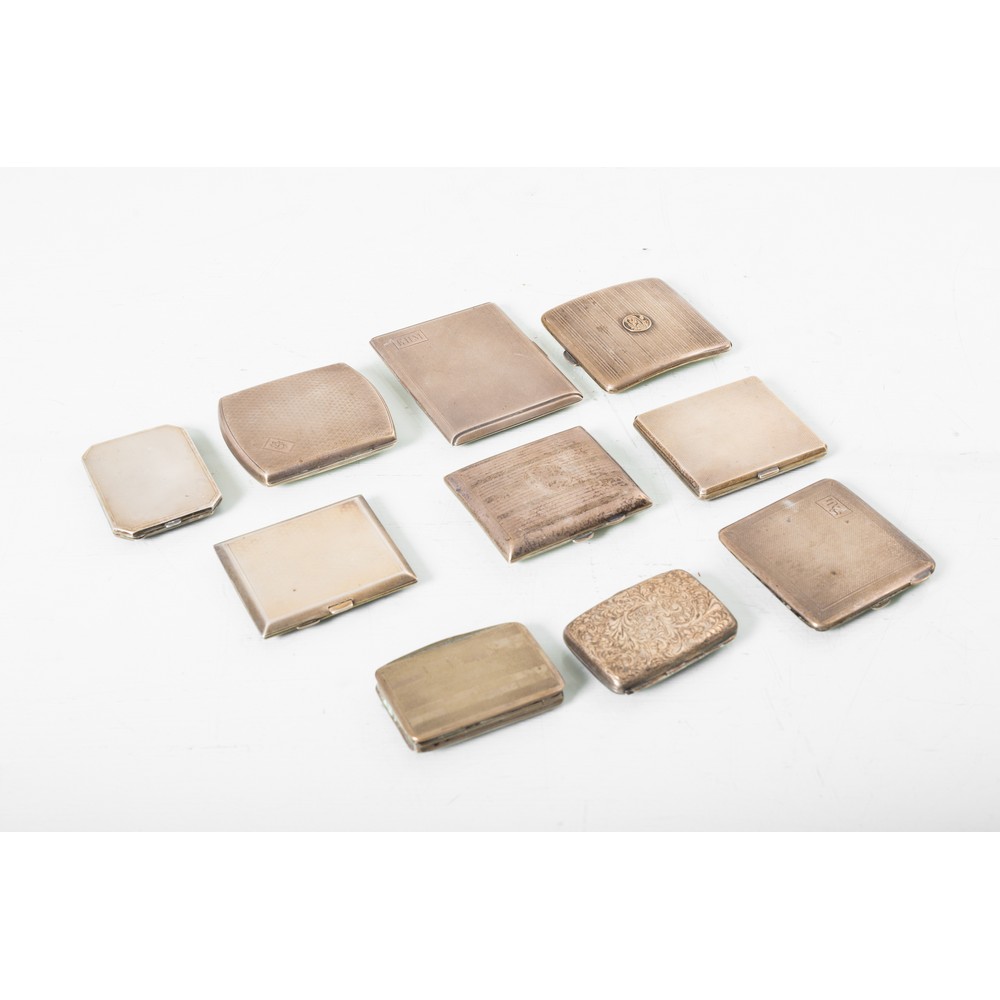 Sette portasigarette in argento a decoro guilloché ed uno in argento cesellato a motivo fogliaceo; portasigarette in argento con decoro a guilloché con monogramma (Officine di Chester della fine del XIX secolo), tabacchiera in argento con punzone con fascio littorio, portacipria in argento con decoro a guilloche' (Officine di Birmingham del 1945) (g. 867).