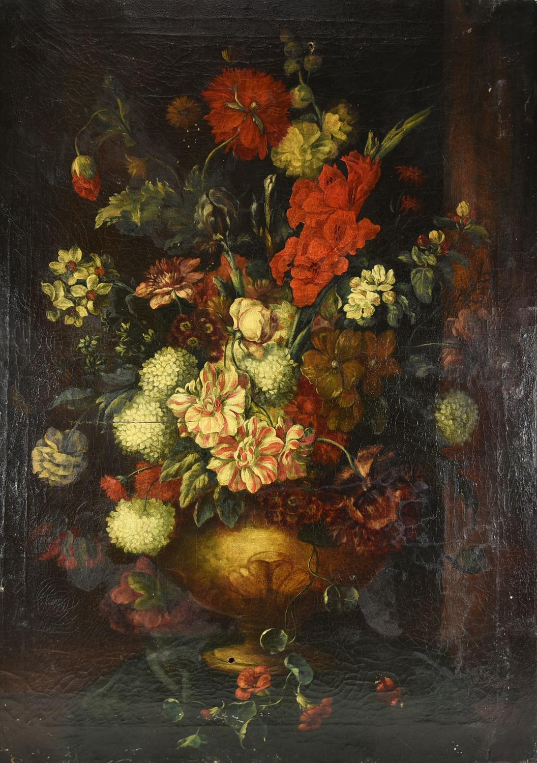 Scuola del XVIII secolo NATURA MORTA olio su tela, cm 104,5x74 sul retro:...