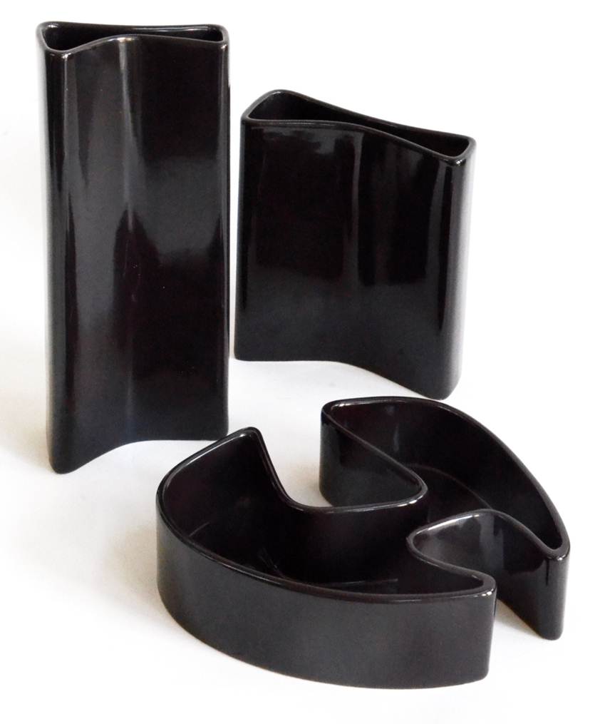 Angelo Mangiarotti (Milano, 1921) Tre contenitori Produzione: Ceramiche Brambilla, 1968 Vitreous china smaltata color manganese cm 6 h x 20 x 17 cm 18 h x 14,5 x 6 cm 26 h x 5 x 11