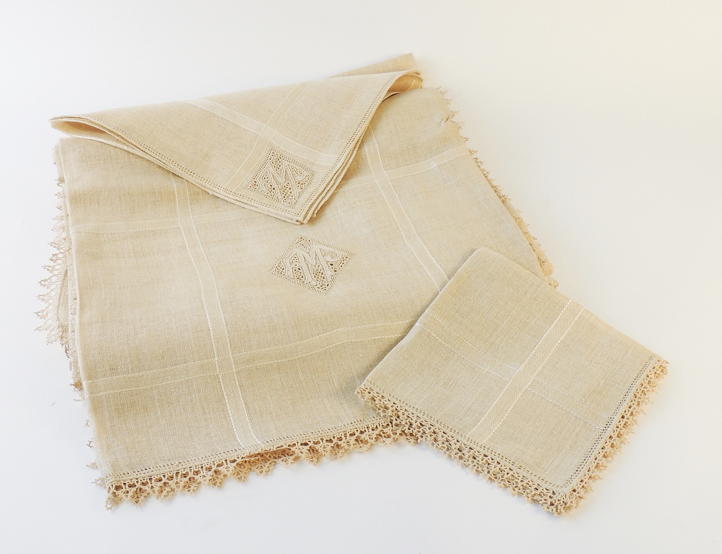 TOVAGLIA IN LINO COLOR ECRÙ inizio del XX secolo con applicazioni in merletto, ricamata a sfilato con monogramma MCP iscritto in piccoli rombi, corredata da dodici tovaglioli e dodici salviette en pendant cm 280x168 (25)