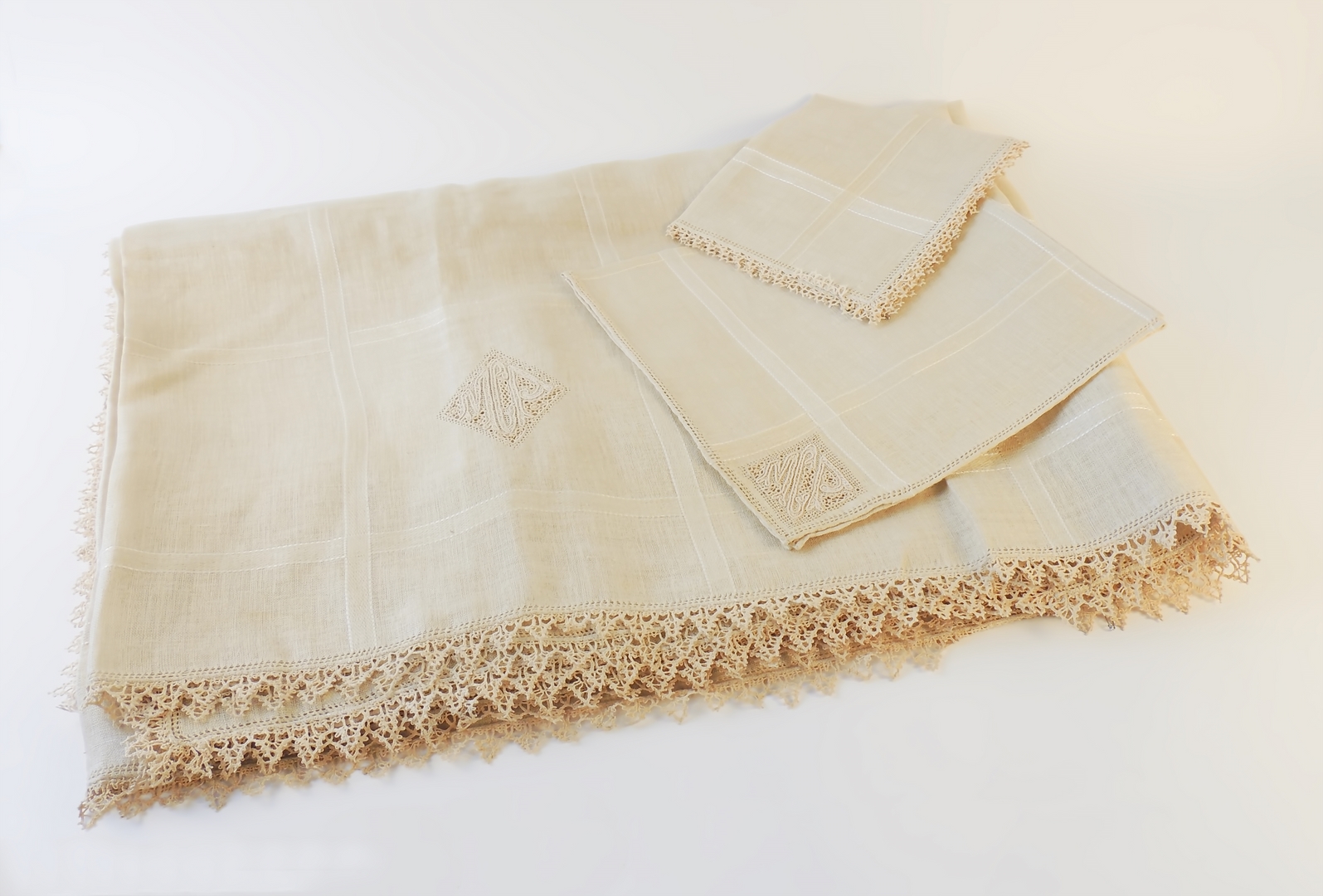 TOVAGLIA IN LINO COLOR ECRÙ inizio del XX secolo con applicazioni in merletto, ricamata a sfilato con monogramma MCP iscritto in piccoli rombi, corredata da dodici tovaglioli e dodici salviette en pendant cm 276x175 (25)
