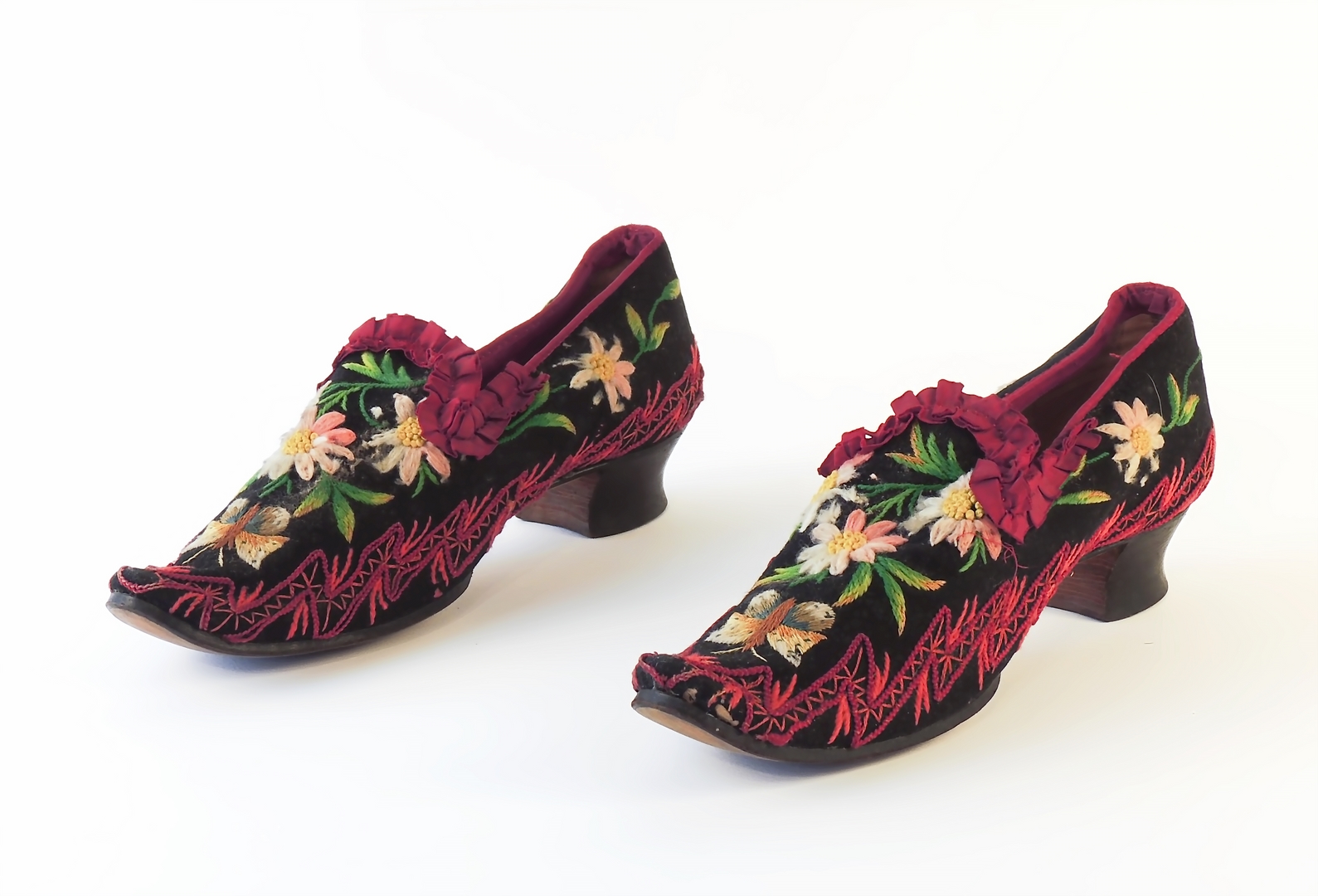 LOTTO VINTAGE XIX secolo un paio di scarpine da donna con tomaia in panno nero ricamato con motivi floreali e farfalle e due cappellini da uomo in seta (3)