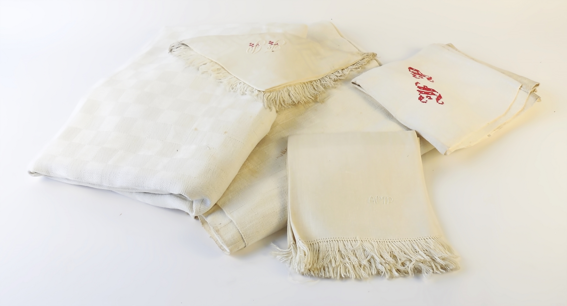 LOTTO DI BIANCHERIA fine del XIX/inizio del XX secolo composto da tre tovaglie rustiche simili corredate da otto tovaglioli, un grande telo grezzo, nove salviette con bordo a frangia e diciotto piccoli asciugamani in lino, alcuni difetti cm 123x123, cm 230x155, cm 212x175 (39)