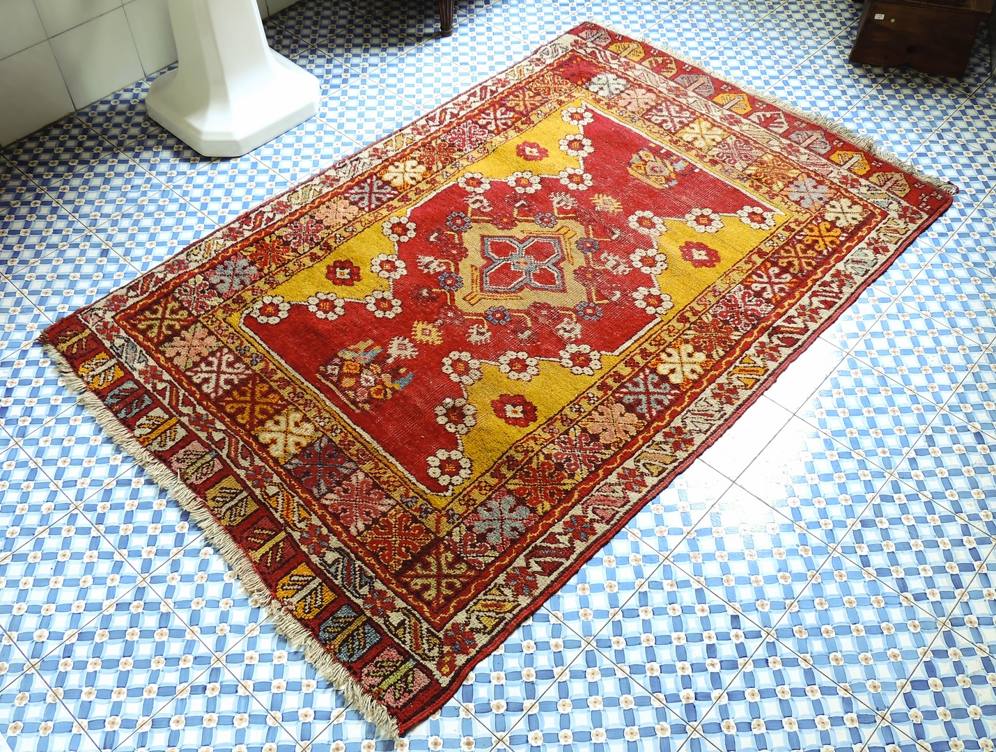 TAPPETO CAUCASICO fondo nei toni del rosso e del giallo, difetti cm 170x110