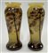 Coppia di vasi in vetro soffiato a stampo nei toni del giallo decorato a smalto con paesaggio, alberi e volatili nei toni del marrone. Prima metà secolo XX. Firmati "Michel". (h cm 25,5) (gravi difetti)