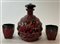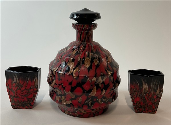 Lotto composto da bottiglia con tappo e due bicchieri in paste vitree rosso, avventurina e nero. 1925ca. (h max cm 16,5) (difetti)