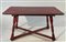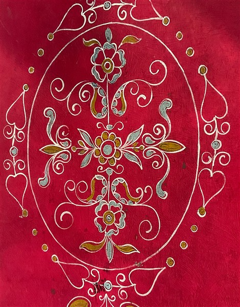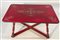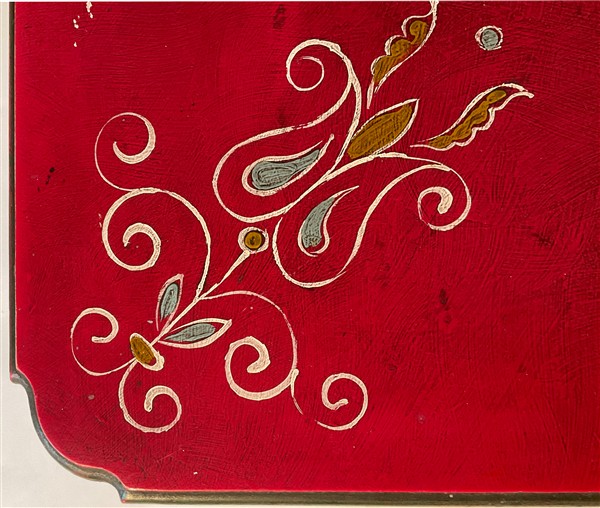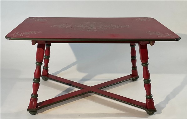 Lotto composto da un tavolo in legno laccato rosso e verde con piano decorato a