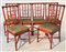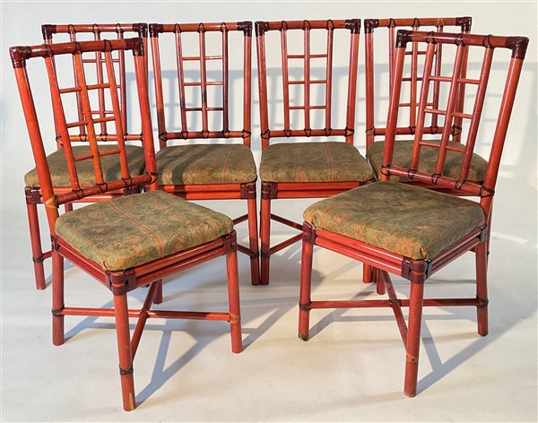 Lotto composto da un tavolo in legno laccato rosso e verde con piano decorato a motivi floreali e gambe tornite, e sei sedie in giunco e midollino laccato rosso con seduta in tessuto verde decorato a fiori. Italia, secolo XX. (tavolo cm 139x75x90; sedie cm 45x99x44) (lievi difetti)
