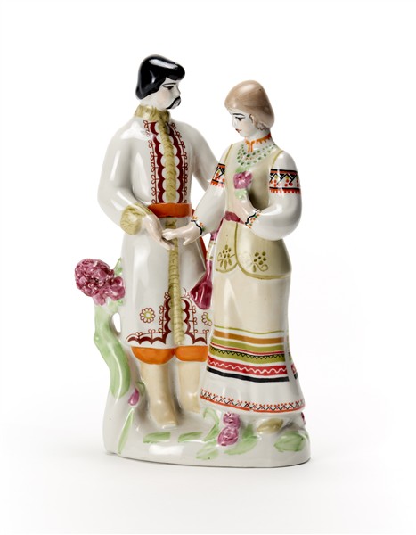Manifattura russa Gruppo scultoreo raffigurante due innamorati in ceramica bianc