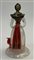 Scultura in vetro soffiato trasparente e viola fortemente iridato con applicazioni di foglia d'oro e di pasta vitrea rossa raffigurante donna in abiti tradizionali. (h cm 21,5) (gravi difetti)