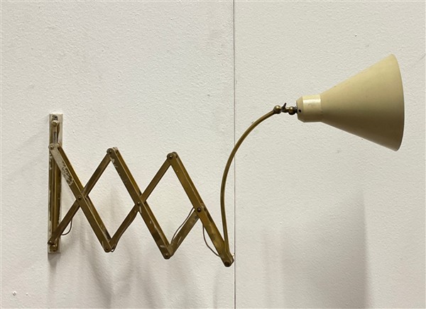 Lampada da parete a pantografo in ottone e alluminio laccato bianco. Italia, anni '50. (l max cm 113) (lievi difetti)