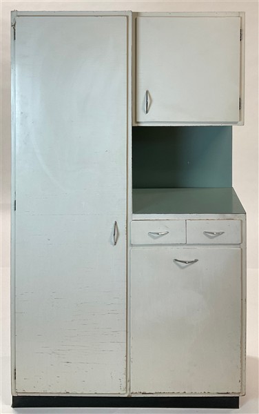 Mobile da bagno in legno laccato bianco e rivestito in formica celeste. Italia, anni '70. (cm 108x185,5x40)