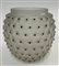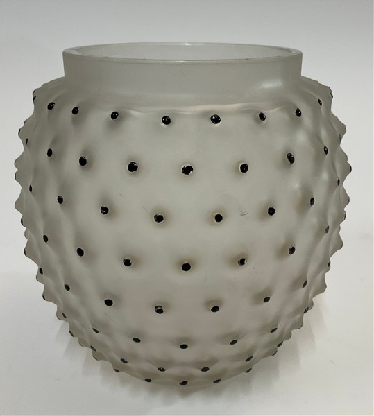 Vaso in vetro soffiato in stampo acidato sulla superficie esterna e decorato con bugne smaltate in nero. Secolo XX. Firma incisa "R LALIQUE FRANCE" sotto la base. (h cm 14) (lievi difetti)