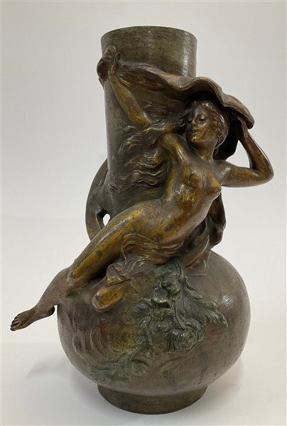 Vaso in bronzo con ansa a figura di Selene, montato a lampada. Francia, inizio secolo XX. Firmato "L. Moreau". (h cm 30) (lievi difetti)