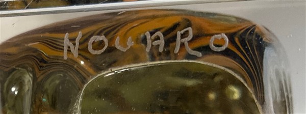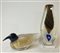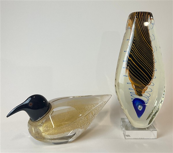 Lotto composto da una figura di uccello in vetro, Toni Zuccheri per Auras Venezia 32/99 (l cm 30) e un vaso in vetro sommerso con base quadrata, firma sul fondo "Novaro" (h cm 31). (difetti)