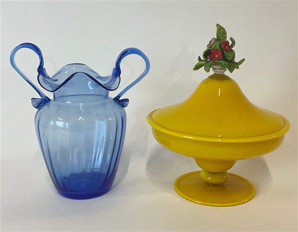 Lotto composto da un vaso biansato in vetro soffiato blu trasparente e da una biscottiera in vetro incamiciato giallo con presa e foglie in pasta vitrea policroma. Secolo XX. (h max cm 25) (difetti e mancanze)