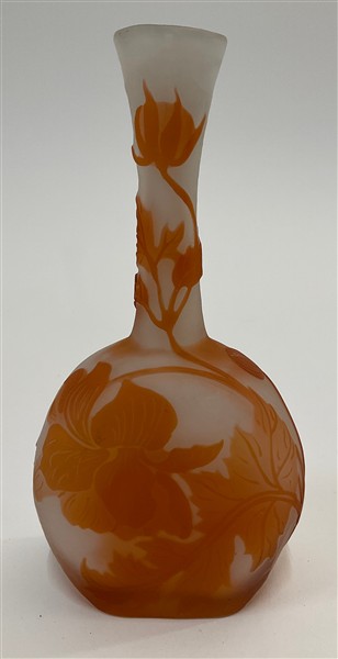 Vasetto soliflore in vetro soffiato cammeo inciso all'acido nei toni opalescente e arancio decorato da fiori e foglie. Nancy, inizio secolo XX. Firmato a cammeo. (h cm 13,5) (difetti)