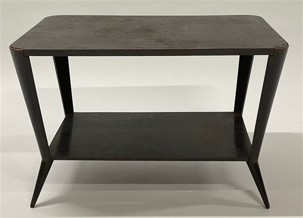 Tavolino a due ripiani in legno tinto scuro. Italia, anni '40/'50. (cm 80x50x51