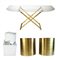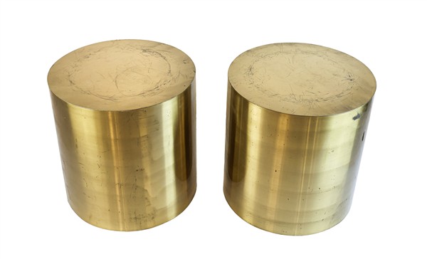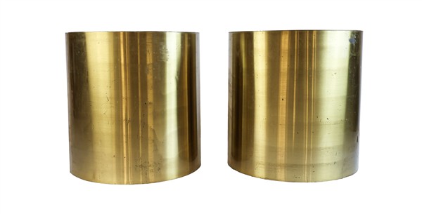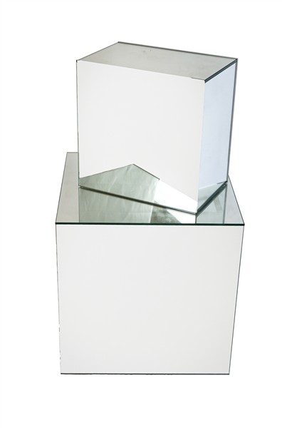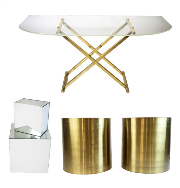 Tavolo console demi-lune con piano in plexiglass e gambe in metallo dorato (cm 143x71x52), due basi cilindriche dorate, e due basi specchiate di cui un cubo (cm 41x41x41) ed un parallelepipedo (cm 30x30x20). (difetti)