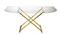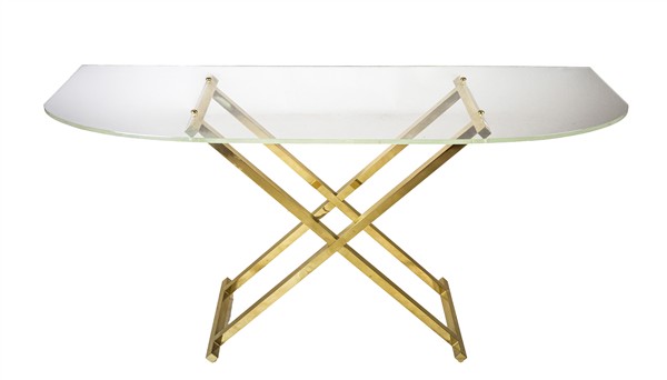 Tavolo console demi-lune con piano in plexiglass e gambe in metallo dorato (cm