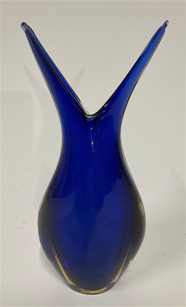 Vaso in vetro sommerso blu, ambra e incolore con collo biforcuto. Murano, anni '60. (h cm 24) (lievi difetti)