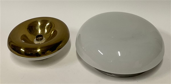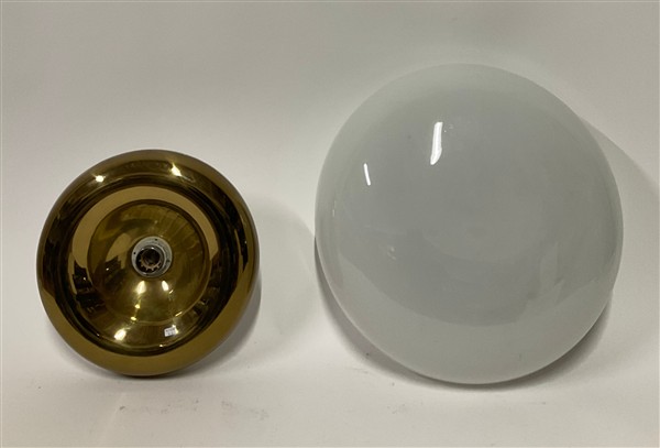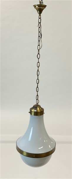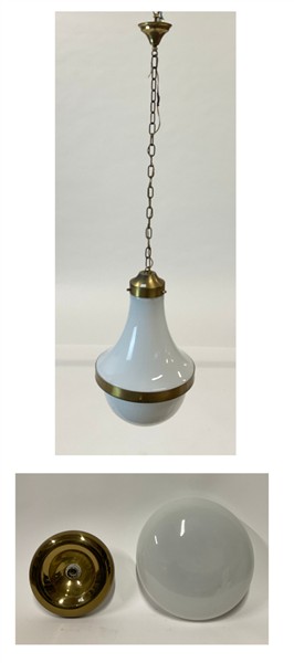 Lampada a sospensione modello "a 194" in ottone spazzolato e nichelato e vetro incamiciato bianco opalino, unita a una plafoniera in metallo e ottone e una grande plafoniera in vetro incamiciato lattimo e metallo. Italia, anni '70.