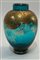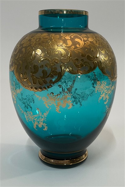 Vaso in vetro soffiato turchese trasparente decorato a fiori e ghirlande vegetali dorate. Italia, seconda metà secolo XX. (h cm 15) (lievi difetti)