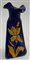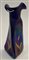 Piccolo vaso di forma triangolare in vetro soffiato blu con superficie esterna fortemente iridata e decorata da fiori in rilievo dipinti in arancio, giallo e dorature. Prima metà secolo XX. (h cm 17) (difetti)