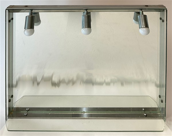 Specchio da bagno a tre luci in lamiera d'acciaio inox e cristallo molato. Italia, anni '70. (cm 72x61x14) (difetti)