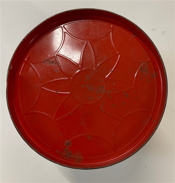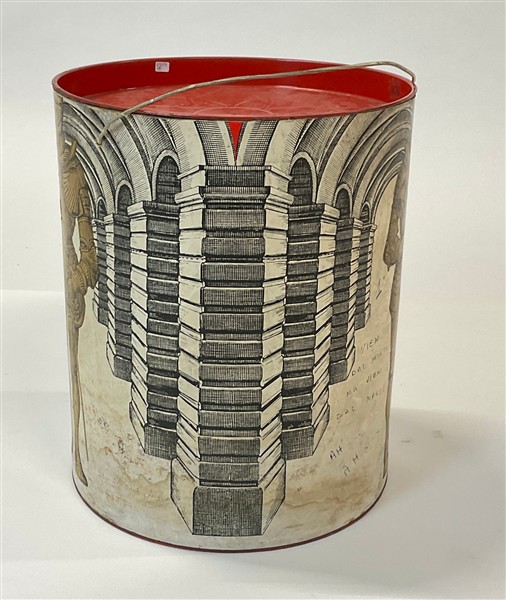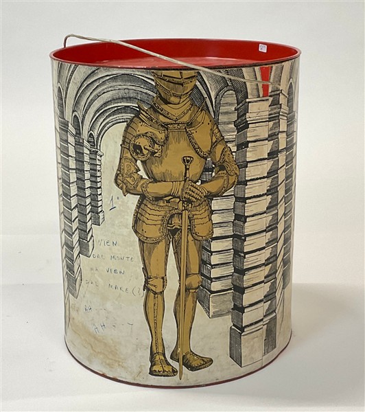 Contenitore cilindrico in metallo rivestito in carta stampata. (h cm 41; d cm 34) (gravi difetti)