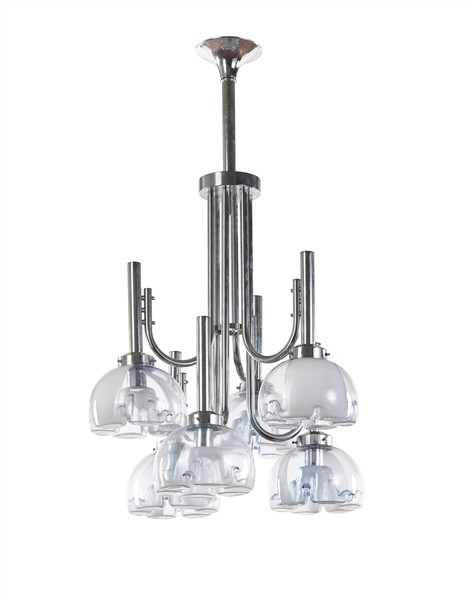 Lampada a sospensione a sei luci con struttura in metallo cromato e diffusori in vetro soffiato trasparente azzurrino con fasce lattimo. Italia, anni '70. (h cm 115; d cm 50) (lievi difetti e piccole sostituzioni)